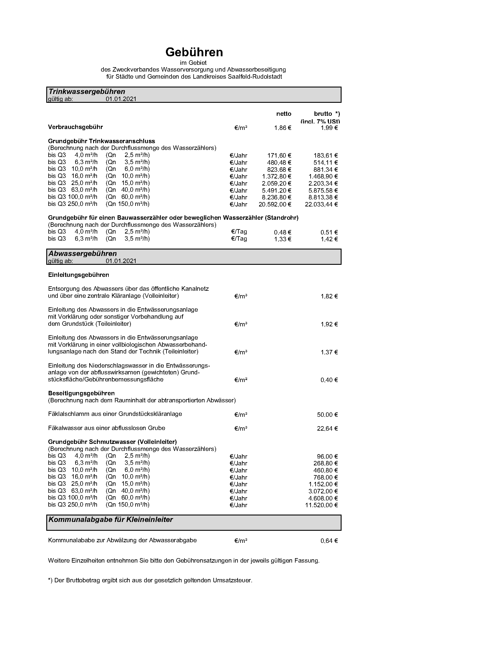 Gebührenübersicht ab 01.01.2021